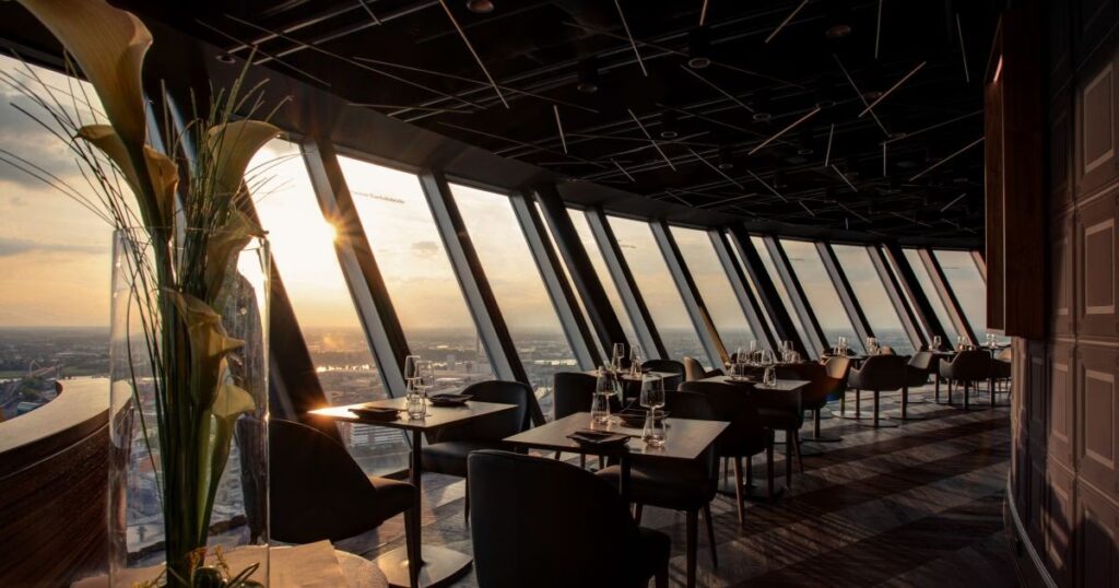Diese sanfte Rotation ermöglicht es Ihnen, während Ihres Besuchs die gesamte Bandbreite der Aussicht zu genießen, ohne Ihren Platz verlassen zu müssen. Die nach außen geneigten Panoramafenster, gefertigt aus dickem Verbund-Sicherheitsglas, verstärken dieses Erlebnis zusätzlich, indem sie einen Blick entlang des Turmschafts ermöglichen und so ein Gefühl von Schwindel auf höchstem Niveau erzeugen – im besten Sinne des Wortes. Es ist ein dynamisches Erlebnis, das den Besuch im QOMO weit über ein gewöhnliches Restaurantessen hinaushebt.
