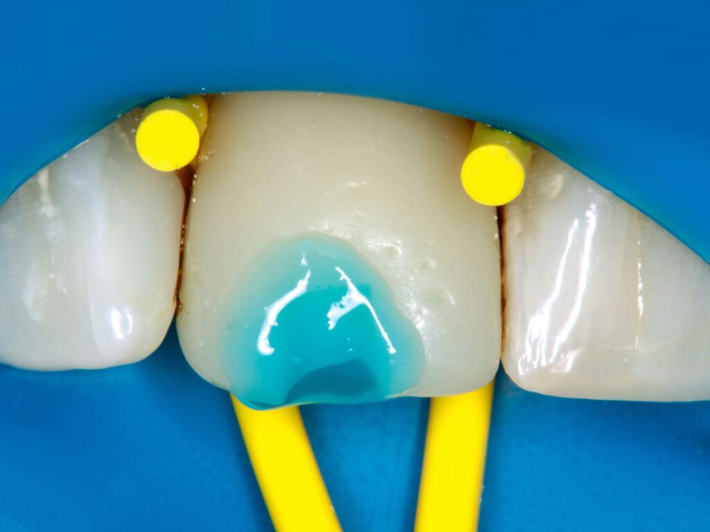 Mittels 30 – 40 prozentiger Phosphorsäure wird der Zahnschmelz und das Zahnbein konditioniert, das heißt ein kleiner Anteil der Mineralien wird herausgelöst. Dadurch bilden sich kleine Vertiefungen im Zahn im Mikrometerbereich. Im Anschluss wird der Kleber, das Adhäsiv aufgetragen.