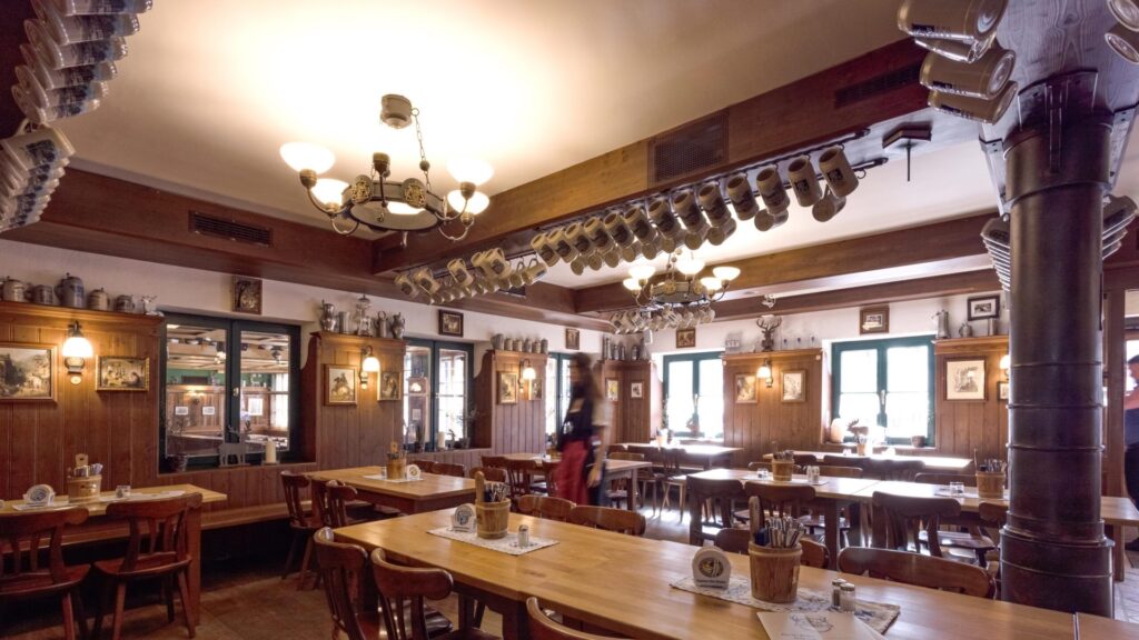 Der Innenbereich des Traditionshauses strahlt eine besondere Atmosphäre aus. Hier spürt man die lange Geschichte des Ortes. Holztäfelungen, gemütliche Nischen und eine traditionelle Einrichtung schaffen ein warmes und einladendes Ambiente. Dieser Bereich ist ideal für ein ausgiebiges Essen oder einen Besuch, wenn das Wetter einmal nicht mitspielt. Die 500 Plätze sind oft gut besucht, zeugen aber auch davon, dass hier eine beachtliche Anzahl von Gästen auch im Inneren Platz findet.