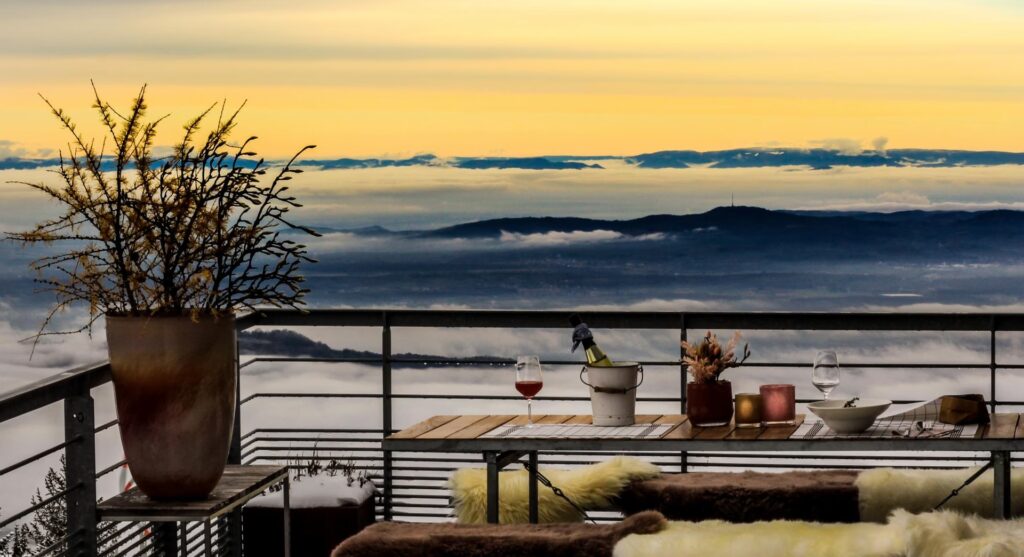 Der eigentliche Höhepunkt ist jedoch die Aussicht, die sich aus der Gondel und natürlich vom Gipfelplateau aus bietet. Der Blick schweift weit über die Rheinebene. An klaren Tagen kann man den Kaiserstuhl als markante Erhebung in der Ebene erkennen. Und noch weiter in der Ferne zeichnen sich die Umrisse der Vogesen in Frankreich ab. Dieses Panorama ist einfach atemberaubend und entschädigt für jede Anreise.